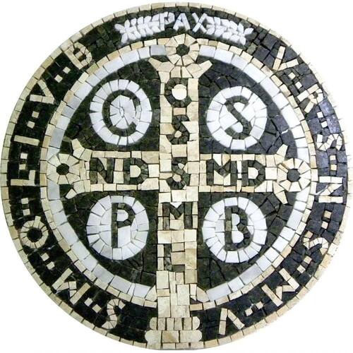 Este mosaico retrata a icônica Cruz de São Bento, um símbolo poderoso de proteção divina contra influências maléficas.