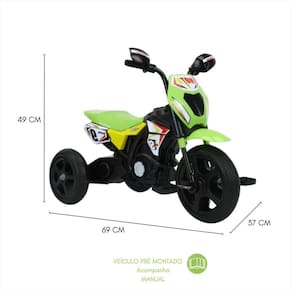 Principais características: - estabilidade e segurança: com três rodas robustas, a mini moto cross garante segurança e equilíbrio para as crianças, permitindo que elas se divirtam com confiança. - bateria 6v recarregável: desfrute de longas horas de diversão com uma bateria potente e fácil de recarregar. - design esportivo e colorido: com um visual vibrante e cheio de estilo, a mini moto cross atrai olhares e faz qualquer criança se sentir um verdadeiro piloto. - fácil de dirigir: simples de manobrar, essa moto é perfeita para ajudar no desenvolvimento das habilidades motoras e coordenação dos pequenos. - ideal para brincadeiras ao ar livre: feita para aventuras ao ar livre, em superfícies planas e seguras.