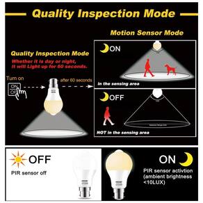 Modo de inspeção de qualidade Seja dia ou noite, acenderá por 60 segundos. Este é o modelo mais recente de lâmpada com sensor de movimento HEKEE. A tampa translúcida usa material personalizado, alta transmitância de luz, difusão uniforme de luz, também tem tecnologia de sonda dupla inteligente ultra sensível. Quando o ambiente é claro, não funciona. Quando o ambiente está escuro, ele começa a funcionar. Muito adequado para escadas, corredor, banheiro, despensa, varanda, portão e assim por diante. Tecnologia avançada de controle de iluminação permite lâmpadas com sensor inteligente HEKEE com sensor integrado do crepúsculo ao amanhecer. As lâmpadas HEKEE entrarão automaticamente no modo de detecção quando a escuridão for inferior a 10lux isso acontece ao anoitecer ou durante a noite quando a escuridão cai. A lâmpada HEKEE Led acenderá quando o detector de movimento for ativado. Não será ligado durante o dia, pois a intensidade da luz aumenta até 10 Lux, o que pode economizar energia, prolongar a vida útil da lâmpada. PIR tecnologia de movimento térmico infravermelho inteligente lâmpada HEKEE Sensor de movimento com o modelo de detecção de indução infravermelho inteligente que acende as luzes automaticamente quando o movimento humano ou animal na escuridão dentro da faixa de detecção. Ele será desligado cerca de 30 segundos após você sair da área. A distância de detecção é de cerca de 2 a 6 metros, dada a altura de instalação e outros fatores. Esta lâmpada com sensor de movimento PIR NÃO funciona através de vidro ou qualquer tampa de lâmpada e deve ser instalada para baixo. Tecnologia inteligente de detecção contínua de movimento as lâmpadas com sensor de movimento HEKEE LED continuam detectando atividades humanas dentro da faixa de detecção. se você não tiver saído da área, ele ligará o tempo todo, mesmo que passem 30 segundos. A contagem regressiva de 30 segundos começará a partir do seu último movimento, então você não precisa se preocupar com a lâmpada do sensor de movimento IR desligar repentinamente quando você ainda estiver na faixa de detecção Marca: Não Informado
