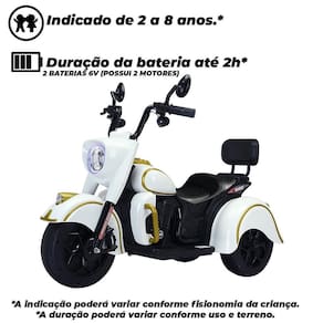 Moto elétrica grande infantil menino menina 2 baterias 6v Cor: branca Mini moto elétrica infantil good mood - chopper Seu pequeno a vai se amarrar com a mini moto elétrica, feito especialmente para proporcionar mais diversão e ajudar no desenvolvimento pedagógico. Ela ajuda na coordenação motora, percepção de movimento, entre outras coisas. Hora de se aventurar Movida a bateria recarregável, com luz e sons, além de ser super fácil de carregar, de forma que será uma boa opção para divertir-se nos parques, praças ou no sítio. Recarregável acompanha carregador bivolt - carregador com ponta tipo americana, deverá usar adaptador benjamin-t - o produto não acompanha adaptador. Bateria: 2 baterias de 6v unipower - de 1 ano diretamente com a fabricante . Velocidade máxima: 5km/h. Duração bateria: 1h a 2hs varia conforme uso e vida útil da bateria . Estrutura em aço e bases plásticas. Funções: frente e ré botão central Acelerador: pé direito . Led no farol e lanternas. Toca música, entrada usb, faz barulho de buzina. Rodas Possui 3 rodas para maior estabilidade fabricadas em plástico. Dimensões Montada: 112cm x 53cm x 62cm cxlxa Adesivos vinílicos. Indicado para qual idade Indicado de 2 anos até 8 anos. Suporta até 60kg. Realize a montagem ao receber com regulagens O produto segue semi-montado, ao receber realize sua montagem seguindo as indicações verifique se está regulado para melhor utilização pela criança. Sempre indicamos levar à uma oficina especializada para montagem. Homologação Inmetro: ABCP-BRI-0081-2021-22