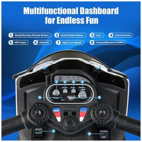 Aparência autêntica e design confortável Com aparência legal, tubo de escape simulado e farol brilhante, o passeio de motocicleta licenciado pela BMW foi projetado para imitar uma motocicleta real. Além disso, o assento estendido e as alças fáceis de segurar proporcionam às crianças uma experiência de direção confortável. Fácil de montar e controlar A operação superfácil liberta seus filhos do aprendizado cansativo. As crianças só precisam pressionar o botão liga , desliga e pisar no pedal para acelerar. Depois de soltar o pedal, a motocicleta infantil pode parar imediatamente. E também há interruptores de velocidade alta, baixa e avanço, reverso. Painel multifuncional para diversão sem fimO painel é equipado com botão de buzina, várias músicas embutidas e rimas de estudo, bebê para animar as crianças. A porta USB e a entrada de MP3 disponibilizam mais recursos ainda mais. Além disso, é fácil aumentar e diminuir o volume através do botão de volume. Estrutura estável de 3 rodasEquipado com rodas resistentes ao desgaste, o passeio infantil de motocicleta é adequado para vários terrenos, como estrada de asfalto, estrada de cimento, estrada de tijolos e calçadão. 3 pneus texturizados largos devem suportar uma criança com menos de 30 kg ajudando a a manter o equilíbrio. Brinquedo Ideal para Acompanhar CriançasA motocicleta elétrica é um presente perfeito para meninas e meninos de 3 a 8 anos, que não só adiciona entretenimento à sua infância, mas também cultiva sua coordenação olho mão e habilidades motoras grossas. A bateria recarregável de 12V de alto desempenho permite que as crianças desfrutem de uma diversão de condução mais longa Marca: Não Informado