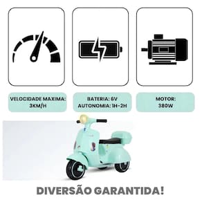 Equipada com bateria recarregável de 6V, a scooter proporciona velocidade segura para crianças, além de luz frontal, sons e músicas integradas, deixando a brincadeira ainda mais emocionante.