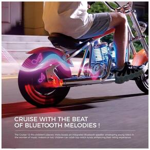 Navegue com a batida das batidas Bluetooth: A moto elétrica infantil CHALLENGER 12 Plus vem equipada com um alto falante Bluetooth integrado, permitindo que os jovens pilotos tomem suas faixas favoritas em qualquer lugar. Quer estejam dentro ou fora, as crianças podem curtir músicas nítidas, adicionando uma camada extra de emoção para sua jornada