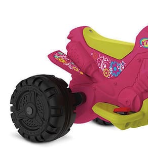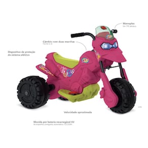 Para alegria dos pequenos temos duas lindas cores disponíveis pra serem escolhidas, a cor Pink e a Titanium. Ela também está mais divertida, com vários relevos imitando peças de moto, trazendo assim a imaginação mais perto da realidade possível, ainda contamos com diversos adesivos espalhados pelo copo do brinquedo. Sua velocidade aproximada é de 3,5 Km/h.