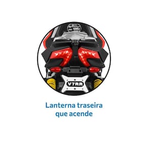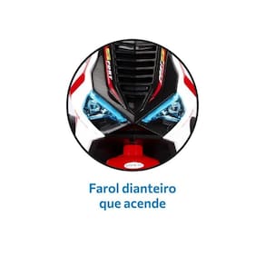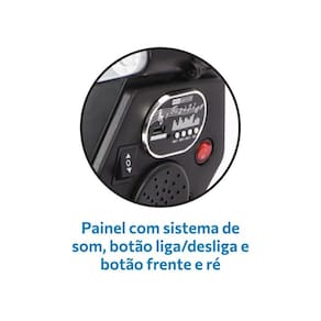Farol dianteiro com iluminação realLanterna traseira com iluminação realLimitador de giro do guidãoEntrada USB e conexão BluetoothSeletor de músicaBotão de liga e desligaBotão de frente, ré e ponto mortoAceleração progressiva na manoplaFreio a pedalDispositivo de proteção do sistema elétricoMovido por bateria recarregável de 12VIndicador de bateriaAcompanha carregador 110/220V