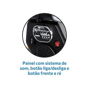 Farol dianteiro com iluminação realLanterna traseira com iluminação realLimitador de giro do guidãoEntrada USB e conexão BluetoothSeletor de músicaBotão de liga e desligaBotão de frente, ré e ponto mortoAceleração progressiva na manoplaFreio a pedalDispositivo de proteção do sistema elétricoMovido por bateria recarregável de 12VIndicador de bateriaAcompanha carregador 110/220V