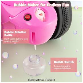O painel de operação deste motor elétrico vem com botão de música para diversão extra durante o jogo. Além disso, o carro bolha é equipado com faróis iluminados por LED para brincadeiras seguras durante a noite e equipado com buzina para alertar os pedestres.