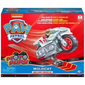 Acelere para o resgate com o primeiro membro felino da Patrulha Canina, Wildcat, e seu veículo Moto Pups Deluxe A motocicleta exclusiva da Wildcats apresenta gráficos e detalhes autênticos, rodas grandes e uma função pullback que permite realizar cavalinhos Equipado com sua jaqueta e capacete de motociclista, a figura do Wildcat incluída está pronta para se juntar aos filhotes para uma emocionante ação dos Moto Pups. Quando chegar a hora de uma missão em alta velocidade, prenda o Wildcat no banco do motorista, puxe o veículo para trás e observe o partir. . A motocicleta Wildcats avança, saltando em um cavalinho, correndo direto para a aventura Puxe o veículo para trás para criar suas próprias acrobacias e cavalinhos repetidas vezes, é muito divertido Você também pode empurrar o Wildcats Deluxe Vehicle para jogar manualmente. Os veículos Moto Pups Deluxe dão vida às motocicletas PAW Patrols do seriado de sucesso Colete todos eles, cada um vendido separadamente, e use sua imaginação para salvar o dia. Para ainda mais diversão com os Moto Pups, use os Veículos Deluxe com o Playset Moto HQ vendido separadamente e lance e cavalinho para o resgate. Junte se ao Wildcat em missões cheias de ação com seu veículo Moto Pups Deluxe O veículo PAW Patrol Moto Pups Wildcat Deluxe é o presente perfeito para crianças a partir de 3 anos. Não são necessárias baterias. Compatível com o Playset Moto HQ vendido separadamente. Os brinquedos de pelúcia e carrinhos de brinquedo PAW são brinquedos pré escolares para meninos e meninas que gostam de construir brinquedos Ótimos presentes para crianças, como alternativa a bonecas, brinquedos de dinossauros ou um conjunto de trem. Inclui 1 figura Wildcat, 1 veículo Moto Pups Wildcat Deluxe.