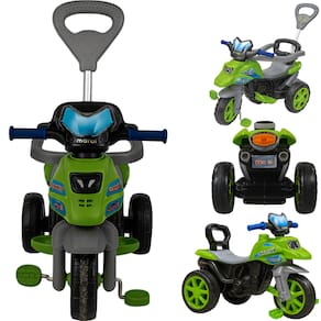 Indicação: A partir de 12 meses Capacidade máxima: 30kg Função passeio com empurrador, aro protetor e apoio para os pés Função pedal com pedais de tração com corrente de aço Cinto de segurança presente nas duas fases Haste com gancho que suporta até 1,5kg Pedal com eixo e corrente de aço Com buzina Assento anatômico Composição: Polietileno, plástico, metal e borracha Garantia: 90 dias (fornecida pelo fabricante) Certificado de Segurança Inmetro: Registro nº 007291/2021