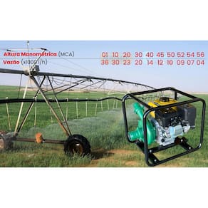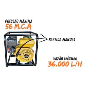 - Com sistema centrífuga, é recomendado utilizar sempre com água limpa. Entrega altura manométrica máxima de 59 MCA com sucção de 2.1/2” e recalque 2”. Motor com partida manual fácil, ou seja, liga em até 3 puxadas em todas as situações.