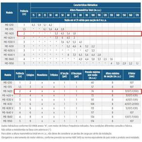 Para bombeamento de água acima de 70C, utilize ME-BR (rotor de bronze e selo mecânico de Viton).