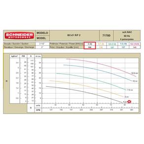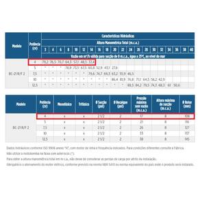 Especificações Técnicas: Potência: 4 cv Tensão:220/440 Volts Fase: Monofásico - com capacitor Monoestágio Diâmetro Sucção: 2 1/2 Polegada Diâmetro Recalque: 2 Polegada Pressão máxima sem vazão: 17 mca Altura máxima de sucção: 8 mca Diâmetro Rotor: 108 mm Bocais com rosca BSP Caracol da motobomba de ferro fundido GG-20 Intermediário de ferro fundido GG-15 Rotor de ferro fundido GG-15 Selo mecânico constituído de aço inox AISI-304, buna N, grafite e cerâmica Motor elétrico IP-55, 2 Polos, 60 Hz Modelo R: bocais roscados Somente a motobomba, sem flange de sucção e recalque