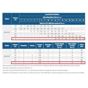 Especificações Técnicas: Modelo: BC-91 S Monoestágio Potência: 1 CV Tensão: 220/380 Volts Fase: Trifásica Diâmetro Sucção: 1 1/4 Polegada Diâmetro Recalque: 1 Polegada Diâmetro Rotor: 123 mm Pressão máxima de autoaspiração: 8 m.c.a. Altura máxima sem vazão: 28 m.c.a. Material do rotor: Aluminio Modelo S: motobomba sem intermediário Caracol de ferro fundido GG-15 Selo mecânico constituído de aço inox AISI-304, buna N, grafite e cerâmica Motor elétrico IP-21, isolamento classe F, 2 polos, 60 Hz (Motor com flange incorporada para a linha S)