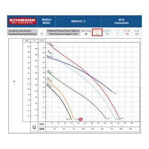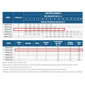 Especificações Técnicas: Modelo: BRAVA EV10 Potência: 1CV Tensão:380 Volts Fase: Trifásica Diâmetro Recalque: 2 Polegada Diâmetro máximo dos sólidos: 25 mm Pressão máxima sem vazão: 18 mca Diâmetro Rotor: 108 mm Bocal roscado BSP Caracol da motobomba de ferro fundido cinzento GG-20 Rotor semiaberto Vórtex de Noryl 30% fibra de vidro para os modelos DV / EV até 1 cv Placa de fundo de ferro fundido GG-20 (modelos E/EV40) Selo mecânico constituído de aço inox AISI-304, buna N, hard carbon e cerâmica para os modelos DV / EV até 1 cv Selo mecânico duplo, constituído de aço inox AISI-304, buna N, grafite e cerâmica para os modelos D / E / EV40 Motor elétrico IP-68, 2 polos, 60Hz, refrigerado com óleo dielétrico, eixo de aço inox AISI-420 As motobombas monofásicas possuem opção com boia elétrica para acionamento automático (modelos DV / EV) Motor monofásico com proteção térmica (modelos DV / E / EV) Comprimento do cabo de ligação: 7 m (modelos DV / EV) e 10 m (modelos D / E / EV40)