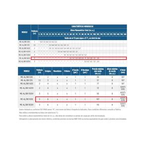 Especificações Técnicas: Modelo: ME-AL 1630 Potência: 3 cv Tensão:127/254 Volts Fase: Monofásica - com capacitor Diâmetro Sucção: 1 Polegada Diâmetro Recalque: 1 Polegada Pressão máxima sem vazão:8 m.c.a Altura máxima sucção:108 m.c.a Diâmetro Rotor: 4 (107mm)/ 2 (100mm) Número Estágios: 6 Bocais com rosca BSP Rotor fechado de alumínio - Selo Buna Eixo de aço inox AISI-420 Selo mecânico constituído de aço inox AISI-304, buna N, grafite e cerâmica (ME-AL) e Viton Lateral de entrada, divisão, corpo de saída e intermediário de ferro fundido Motor elétrico IP-21, 2 polos, 60 Hz (até 3 cv)