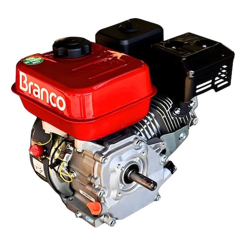 - O motor estacionário movido a gasolina da Branco possui 6,5 cv de potência máxima e 5,0 cv de potência contínua. Essa versão conta com alerta de óleo, um é um sistema de proteção que desliga o motor automaticamente quando o óleo fica no nível mínimo para não danificar o equipamento.