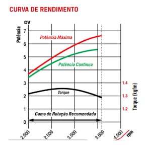 - Motor: Horizontal - 4 Tempos - Potência Máxima do motor: 6,5 CV @ 3600 rpm - Potência Nominal do motor: 5,5 CV @ 3600 rpm - Torque Máximo: 1,35 kgf.m @ 2500 rpm - Cilindros: Monocilindrico - Cilindradas 196 cc - Diâmetro x Curso: 68x54 mm - Combustível: Gasolina - Taxa de compressão 8,5:1 - Ignição: Elétrica/Eletrônica - Rotação Máxima: 3600 rpm - Controle de velocidade: RAR - Regulador Automático Rotação - Capacidade do tanque máxima 3,6 L - Capacidade do tanque de óleo: 0,6 L - Óleo recomendado: 20W50 - Sistema de partida: Manual - Tipo do Filtro de ar: Espuma - Lubrificação: Salpico - Sensor de óleo: Com alerta - Tipo de eixo: Horizontal - Chavetado - Diâmetro do eixo: 3/4" (19,05 ± 0,05mm) - Comprimento do eixo: 61,0 ± 0,1 mm - Consumo médio: 1,70 l/h
