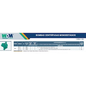 Motobomba Centrífuga Monoestágio - Motor Monofásico , 60Hz, 3500rpm - Bocais com rosca BSP, Sucção 1" x Recalque 1". - Eixo ponta em inox - Utilizada para água limpa até temperatura de 40ºC - Rotor fechado em Bronze. - Anel O'ring de vedação da carcaça em Buna N. - Selo mecânico: Faces em grafite e cerâmica. Mola em inox 304 e elastômero (borracha) em Buna N.