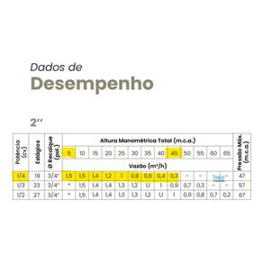 Aplicação Recomendada para bombeamento e recalque de água limpa isenta de sólidos em poços, abastecimento de cisternas, captação de água de rios, mineração, industrias e pequenos sistemas de irrigação.