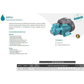 Motobomba Periférica Lepono APm75 1.0hp 220V Monofásica. Utilizada principalmente para abastecimento doméstico e pequenos prédios. Sistemas de pressurização de baixa pressão. Irrigação de pequeno porte. Sua principal característica é o bombeamento de água à grandes alturas e distâncias. Referência: 50000407100 VANTAGENS: Baixo custo, Grande versatilidade de usos. CARACTERÍSTICAS TÉCNICAS Bomba: Corpo em ferro fundido, Tratamento antiferrugem, Rotor periférico em bronze, Ponta de eixo em aço inox AISI 304 Antitravamento duplo em bronze, Temperatura máxima do líquido: 60C, Sucção máxima: 8 mca, Selo mecânico em grafite cerâmica buna Motor: Protetor térmico, Classe de proteção: IPX4, Classe de isolação: F, Temperatura ambiente máxima: 40C. Modelo do Selo Mecânico: Grafite Cerâmica Buna. Marca: Lepono. Conteúdo da embalagem: 1 Motobomba. Dimensões aproximadas do produto: 19,0 x 14,0 x 30,0 cm (A x L x C). Dimensões aproximadas da embalagem: 22,0 x 19,0 x 34,0 cm (A x L x C). Peso aproximado do produto: 5 Kg. Peso aproximado da embalagem: 5,5 Kg. Informações Adicionais: Maior qualidade e durabilidade no dia a dia. Produtos de decoração não inclusos. Imagens meramente ilustrativas. As cores dos objetos podem sofrer alterações devido a luminosidade, configurações do monitor e até mesmo a percepção do usuário.