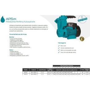 Utilizada principalmente para abastecimento doméstico e pequenos prédios. Sistemas de pressurização de baixa pressão. Irrigação de pequeno porte. Por ser uma bomba autoaspirante, pode ser utilizada diretamente na tubulação da companhia de saneamento. Grande versatilidade de usos, retira o ar da tubulação de sucção e possui válvula de retenção interna .Cor: Verde e preto. Modelo: APSM37LTipo: Periférica autoaspirante. Potência: 0.5 Hp. Voltagem: Monofásica. Características da bomba: Material: Ferro fundido. Material da ponta: Aço inox. Material do rotor: Bronze. Tratamento: Antiferrugem. Rotor: Periférico. Sucção máxima: 8 mca. Temperatura líquido: 60C. Selo mecânico: Grafite cerâmico buna. Características do motor: Classe de isolação: F. Classe de proteção: IPX4Possui protetor térmico: Sim. Temperatura ambiente máxima: 40C. Marca: Lepono. Conteúdo da embalagem: 1 Motobomba. Dimensões aproximadas do produto: 23.4 x 17 x 23.9 cm A x L x C Dimensões aproximadas da embalagem: 27 x 20 x 28 cm A x L x P Peso aproximado do produto: 6,2 Kg. Peso aproximado da embalagem: 7,2 Kg. Informações Adicionais: Possui válvula de retenção interna. A compra do produto não acompanha montagem/desmontagem. Produtos de decoração não inclusos. Imagens meramente ilustrativas. As cores dos objetos podem sofrer alterações devido a luminosidade, configurações do monitor e até mesmo a percepção do usuário. Ean: 7908172500164