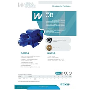 Motobomba Periférica Modelo: QB60H Aplicações Gerais: - Abastecimento doméstico;- Abastecimento de pequenos prédios;- Sistema de irrigação residenciais;- Reaproveitamento de água pluviais; Vantagens: - Excelente custo-benefício. - Produto versatíl de amplas aplicações - Leve e compacta - Para água isenta de sólidos. BOMBA - Inserto anti travamento em aço inoxidável - Tratamento antiferrugem - Conexão 1 BSP recalque - Corpo de Ferro fundido - Rotor periférico em latão - Temperatura do líquido: Máx. +60ºc - Sucção máxima: 8m - Selo mecânico em grafite cerâmica buna MOTOR - Protetor térmico - Grau de proteção: IP44 - Temperatura ambiente máx. +40ºc - Tensão única: 110V ~ 127V 220V