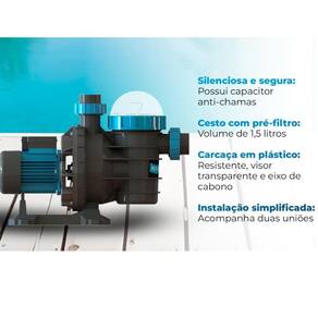 Esta motobomba acompanha 2 uniões para encaixe no tubo de 50 mm; Ela tem sua ligação elétrica monofásica 220 volts qualquer duvida consulte-nos no campo de perguntas Compativel com filtro da sodramar : fm36 para outros filtros consulte-nos no campo de perguntas A sodramar oferece o que há de mais avançado em tecnologia de motobombas, purificando a água e priorizando a qualidade do lazer e a saúde dos usuários. As motobombas residenciais sodramar, são constituídas de material resistente e a prova de corrosão, possuem alta vazão, atuando com eficiência e segurança; além de serem auto-escorvantes, permitindo que trabalhem acima do nível da água. Os modelos variam de 1/4 à 1,0cv e sem dúvidas, este produto atenderá sua necessidade de forma satisfatória. A bomba bmc-33 t.U está disponível com ligação monofásica 220v . Informações gerais: Comprimento = 52 cm Largura = 24 cm Altura = 35 cm Pressão mca x m/h = 4 mca = 11,9 m/h 6 mca = 8,8 m/h 8 mca = 6,0 m/h Motobomba segue com pré filtro e cesto coletor; Produto possui de 12 meses direto com a fábrica a sodramar possui assitência técnica em todo território nacional Marca: Não Informado