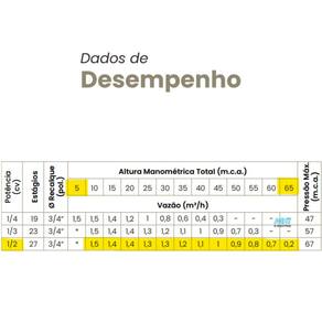 Motobomba Submersa 2" Lepono ou Claw 1/2 Hp 2 Fios 220v ESPECIFICAÇÕES: • VAZÃO Máxima 1.300 L/H. • POTÊNCIAS: 1/2 HP monofásico. • Altura máxima de 55 MCA ( Tabela de altura x vazão na foto do anuncio ). • DIÂMETRO: 2'' (Para Poço com diâmetro acima de 60 mm). • Bocal de recalque com rosca 3/4" polegada. • Controlador Interno ( Não utiliza painel/Box ). APLICAÇÕES: • Captação de água potável em poços com diâmetro mínimo de 2" • Abastecimento de residências, chácaras, sítios e indústrias • Rebaixamento do lençol freático CARACTERISTICAS DO MOTOR: - Enrolamento em cobre - Protetor térmico - Grau de proteção: IP68 - Classe de isolação: B - Lubrificante do motor: Óleo dielétrico isolante (utilizado nos ramos alimentícios e farmacêuticos) - Selo mecânico em grafite cerâmica buna. ALTURA MANOMETRICA X VAZÃO: - 10 M.C.A - 1.300 L/H - 15 M.C.A - 1.200 L/H - 20 M.C.A - 1.100 L/H - 25 M.C.A - 1.000 L/H - 30 M.C.A - 900 L/H - 35 M.C.A - 800 L/H - 40 M.C.A - 600 L/H - 45 M.C.A - 500 L/H - 50 M.C.A - 100 L/H - Corpo da bomba em aço inox AISI 304 - Temperatura máxima do líquido: 35 °C - Bocal de recalque em bronze e intermediário do motor em aço inox AISI 304 - Rotores flutuantes - ph do líquido: 6 - 8 - Capacidade máxima de areia na água: 40 gr/m³ - Comprimento do cabo de energia: 1,5 metros - Motobomba constituida em aço inox, bronze e termoplástico - Suporta flutuação de tensão Utilizada principalmente para a captação de água em poços artesianos de água limpa e isenta de sólidos em suspensão. Indicada para o abastecimento doméstico e pequenos prédios. Utilizada em sistema de irrigação de pequeno porte. A motobomba multiestágio permite atingir grandes pressões sem sofrer perdas consideráveis na vazão. A Motobomba Submersa Dongyin 2" é perfeita para atender suas necessidades de captação de água de forma eficiente e confiável. Com sua capacidade de trabalhar em poços artesianos de água limpa e livre de impurezas, ela é ideal para abastecer residências e pequenos edifícios. Além disso, essa motobomba é uma excelente escolha para sistemas de irrigação de pequeno porte, garantindo alta pressão sem comprometer o fluxo de água. Não perca tempo e adquira agora a Motobomba Submersa Lepono 2", a solução completa para suas demandas de água.