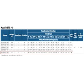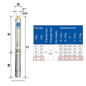 DETALHES TÉCNICOS - Especificações de acoplagem com motor de acordo com a Norma NEMA; - Rotor de fluxo radial; - Bocal de saída 1 com rosca BSP; - Vazão: 0,2 a 3,2 m/h; - Altura Manométrica: 5 a 145 m.c.a.; - Motor elétrico com proteção IP-68, 2 polos, 60Hz; - Motobomba 3F, com Control BOX - Tensão 220v - Potência de 1,5cv; - Temperatura máxima do líquido bombeado: 35C.