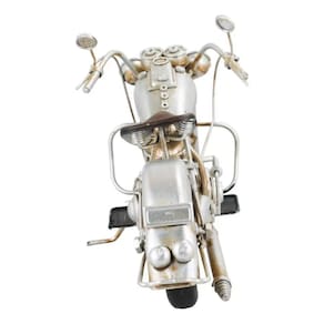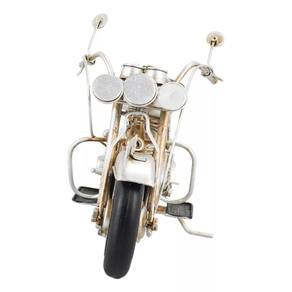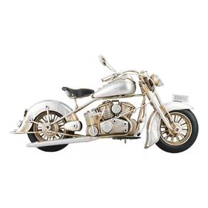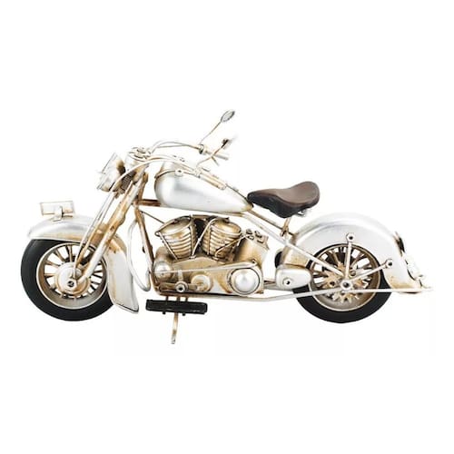 Enfeite decorativo em forma de uma motocicleta prateada com 13,5 x 28 x 9 cm de dimensão, detalhes e cores muito realista. Material: metal; Atenção: este produto tem apenas função decorativa, não é um brinquedo e nem uma motocicleta de verdade!