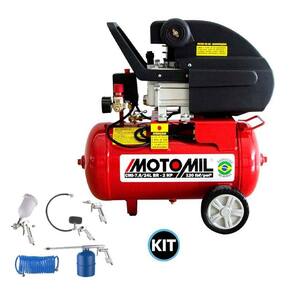 Motocompressor motomil cmi 7,6pcm 24 litros motor 2hp mono 220v + kit acessorios com 5 pecas Motocompressor motomil cmi7,6/24l motor 2hp mono 220v : Motocompressor vai lhe auxiliar no dia a dia. É indicado para uso doméstico, para pinturas diversas com Ferramenta de aplicação de baixa produção, limpeza de pequenas peças e equipamentos, para inflar boias, barcos, balões e pneus. Ele conta com um motor monofásico de 60 hz e uma potência de 2 hp. Modelo : cmi 7,6/24l Código do produto: 37810.2 Potência do motor: 2,0 hp / 1,50 kw Frequência: 60 hz Número de fases: monofásico Voltagem: 220v Rotação: 3420 rpm Capacidade do reservatório: 24 litros Cabo elétrico com plugue: sim liga/desliga: sim Tipo da alça: ergonômica Rodas para transporte: sim Tipo do pé: borracha Regulador da saída: sim Protetor térmico: sim Engate rápido: sim Deslocamento teórico: 7,6 pés3/min - 215 l/min Número de estágios: 1 Número de pistão: 1 em linha Número de polos: 2 polos Pressão de operação máxima: 120 lbf/pol2 - 8,3 bar Pressão de operação mínim: 80 lbf/pol2 - 5,5 bar Volume do óleo : 250 ml Marca: motomil Kit acessorios com 5 pecas : Jogo de acessórios pneumáticos conta com 5 peças fabricadas em material de alta qualidade com encaixe engate rápido. Indicado para utilização em pintura, limpeza, calibração de pneus e lubrificação de peças. Composto por Ferramenta de aplicação pneumática por gravidade com cabeca plastica, Ferramenta de aplicação para limpeza, mangueira de ar espiral, calibrador de pneus com manômetro e pulverizador pneumático com bico longo e tanque baixo. Em polietileno e alumínio Para calibrar pneus, limpeza, artesanato, pulverizações com líquidos, encher bolas, etc. Kit acessórios universal não acompanha engates rápido Dados técnicos: Peso kg : 1,650 Dimensões axlxp mm : 420x270x120 Consumo ar pcm : 5,2 Obs.: rosca 1/4 npt Itens inclusos 01 - motocompressor motomil cmi7,6/24l motor 2hp mono 220v ; 01 - Ferramenta de aplicação para pintura gravidade ; 01 - soprador de ar; 01 - mangueira espiral 3 metros; 01 - calibrador de ar com manômetro; 01 - pulverizador com caneca. Imagens meramente ilustrativas