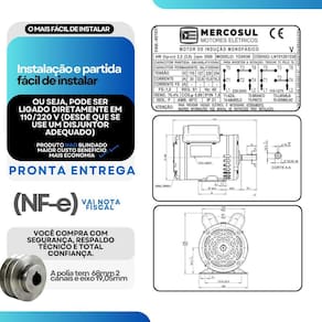 1. Esse motor é bivolt Como faço a ligação correta Sim, o motor é monofásico bivolt, operando em redes de 110-127V ou 220-254V. A ligação correta depende da tensão da rede e deve ser feita conforme o diagrama que acompanha o produto. 2. O motor já vem com polia e capacitor O motor acompanha o capacitor de partida. A polia não está inclusa na versão padrão e deve ser adquirida separadamente, salvo em kits específicos que já incluem a polia. 3. Qual o diâmetro do eixo e o tamanho da chaveta O eixo possui diâmetro de 19,05 mm 3/4 e a chaveta tem 4,76 mm 3/16 , medidas padrão para a maioria das aplicações industriais. 4. Esse motor é compatível com compressores de ar Sim, ele é ideal para compressores de até 15 pés/min e tanques entre 150 e 200 litros, incluindo modelos de 2 estágios. Oferece torque suficiente para aplicações industriais. 5. Pode ser em serras circulares ou policorte Sim, o motor é indicado para serras de bancada, esquadrejadeiras e máquinas de corte. Sua alta rotação e potência garantem desempenho estável para cortes em madeira ou metal. 6. Serve para bombas dágua, lavadoras ou forrageiras Sim, o motor pode ser em bombas hidráulicas, lavadoras , moto-esmeris, forrageiras e outros equipamentos agrícolas e industriais. 7. Qual é o sentido de rotação do motor O motor permite rotação horária e anti-horária. A inversão do sentido pode ser feita na instalação, conforme orientações do diagrama de ligação. 8. É necessário usar chave de partida Não. O motor é de partida direta e já acompanha o capacitor. Pode ser ligado diretamente à rede elétrica, com proteção adequada no disjuntor. 10. Vai com polia Sim, acompanha polia grau de proteção: IP21; - Carcaça: 56 NEMA MG1; - Tensão: 110-127/220-254 V; - Frequência: 60 Hz; - Classe de isolação: F 155 C ; - Diâmetro do Eixo: 19,05mm ou 3/4 de polegada; - Tamanho da chaveta do eixo: 4,76mm ou 3/16 de polegada; - Fabricante: Mercosul Motores; -tecnologia Eberle.