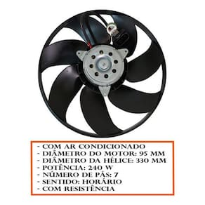 Motor e ventoinha radiador vw up 1.0 flex com ar Seja bem-vindo - motor e ventoinha radiador vw up 1.0 flex com ar Aplicação vw: Especificações: - com de 3 meses - com ar condicionado - diâmetro do motor: 95 mm - diâmetro da hélice: 330 mm - potência: 240 w - número de pás: 7 - sentido: horário - com resistência Atenção - recomendamos que o produto seja instalado por um profissional qualificado. - não nos responsabilizamos pelo mal uso do produto. - qualquer dúvida, por gentileza, utilize o campo de perguntas. do vendedor: 3 meses
