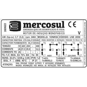 Motor da marca mercosul eberle. Primeira fábrica de motores elétricos, com alta qualidade, confiabilidade e eficiência no brasil. Motor com duplo capacitor, sendo um de partida e outro permanente, garantindo maior força e eficiência do motor. Algumas de suas aplicações mais utilizadas: Compressores Furadeiras de colunas Exaustores Bombas Moto-esmeris Máquinas em geral. Características gerais: Potência: 5cv; 2 pólos, alta rotação; Motores com dois capacitores; Grau de proteção: ip21; Carcaça: 56 nema mg1; Tensão: 220-254/440 v; Frequência: 60 hz; Classe de isolação: f 155 c ; Fabricante: mercosul motores; Tecnologia eberle. : 24 meses com direto com o vendedor.