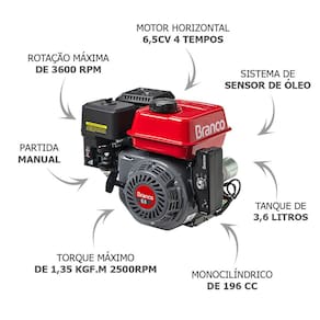 O Motor Estacionário à Gasolina 6,5CV B4T-6.5H da marca Branco é a escolha ideal para quem busca potência e confiabilidade em diversas aplicações, como máquinas agrícolas, geradores e outras ferramentas de uso intensivo. Este motor monocilíndrico de 4 tempos é refrigerado a ar e apresenta uma potência máxima de 6,5CV a 3600 rpm, garantindo alto desempenho para suas atividades.