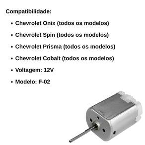 O Motor Trava Elétrica Fechadura F-02 é uma peça de reposição essencial para o sistema de travamento centralizado dos veículos Onix, Spin, Prisma e Cobalt. Projetado para operar em sistemas de 12V, este motor garante o funcionamento eficiente e seguro das travas elétricas das portas, proporcionando conveniência e proteção para o seu veículo.