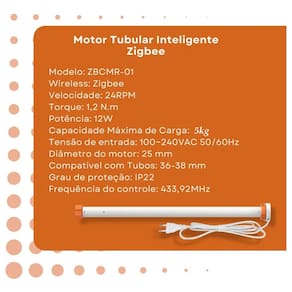 Wireless: Zigbee Velocidade: 24RPM Torque: 1,2 N.m Potencia: 12W Capacidade Máxima de Carga: 5 Kg Tensão de entrada: 100-240VAC 50/60Hz Diâmetro do motor: 25 mm Compativel com Tubos: 36-38 mm Tamanho máximo da cortina na horizontal: 2,5 m Tamanho máximo da cortina na vertical: 2,3 m