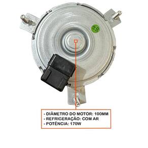 - material de alta qualidade - refrigeração: com ar - quantidade de pás: 6 - diâmetro do motor: 100mm - diâmetro da hélice: 315mm - potência: 170w - rotação: sentido horário