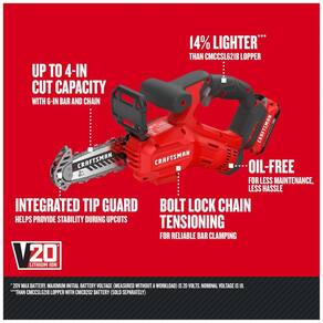 A motosserra de poda V20 é uma excelente opção para quem busca praticidade e eficiência. Equipada com uma bateria de 2,0 Ah, ela tem potência de corte ideal para realizar até 85 cortes por carga. Com barra e corrente de 6 pol, a capacidade de corte é de até 4 pol, o que garante um trabalho rápido e eficiente. Além disso, ela é 50 mais compacta e 14 mais leve do que o modelo CMCCSL621B, o que proporciona facilidade de uso e manobrabilidade. A proteção de ponta integrada é um ótimo recurso e foi projetada para ajudar a fornecer controle sobre cortes superiores. A plataforma da bateria V20 é compatível com equipamentos para atividades ao ar livre e ferramentas elétricas CRAFTSMAN V20, permitindo que você encontre a linha completa de ferramentas e equipamentos essenciais para atividades ao ar livre para um trabalho que o deixará orgulhoso. A motosserra também conta com tensionamento da corrente com trava de parafuso, fixação confiável e bainha de armazenamento com suporte de chave integrado para fácil remoção da bainha. Para maior comodidade, ela é compatível com o sistema de organização de parede VERSATRACK, permitindo que você pendure esta ferramenta diretamente no sistema de organização de parede VERSATRACK vendido separadamente . Com a motosserra V20, você terá uma ferramenta prática, eficiente e confiável para suas atividades ao ar livre.
