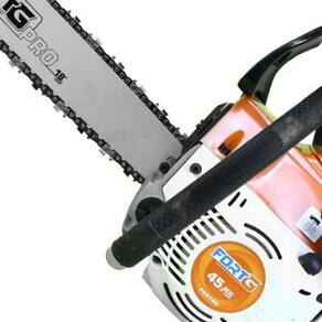 A Motosserra a Gasolina FORTG PRO FG9140 45,2cc 2,28HP com Sabre de 18 Polegadas foi desenvolvida para profissionais que buscam potência, resistência e desempenho elevado em cortes de madeira, galhos grossos, troncos e serviços intensos no campo ou na obra. Com motor 2 tempos de 45,2cc, ela entrega força constante, arrancada rápida e excelente rendimento mesmo em trabalhos prolongados. O sabre dentado de 18 (500 mm) permite cortes longos e precisos, proporcionando produtividade superior para quem precisa derrubar, podar, desgalhar, cortar lenha ou realizar manutenção em sítios, fazendas, condomínios e áreas florestais. Seu motor oferece 2.28HP (1700W) e trabalha em rotação de até 10.000 RPM, garantindo cortes limpos e eficientes com menor esforço. A motosserra FG9140 possui carburador de diafragma, que mantém estabilidade mesmo em inclinações, e sistema de ignição por bobina, que melhora a confiabilidade e facilita o arranque. O sistema de alimentação de óleo com bomba automática ajustável garante lubrificação contínua da corrente, aumentando a vida útil do conjunto e oferecendo cortes mais suaves. O tanque de combustível de 550 ml e o tanque de óleo de 260 ml permitem longos períodos de uso sem interrupções. Com apenas 5,5 kg, a motosserra garante equilíbrio e controle, mesmo durante o uso contínuo. O design robusto e as dimensões compactas proporcionam mais segurança e manuseio confortável. Se você procura uma motosserra a gasolina profissional, forte, confiável e com excelente custo-benefício, a FORTG PRO FG9140 é a escolha ideal para qualquer tipo de trabalho pesado em madeira. FAQs Motosserra a Gasolina 45cc: 1. A motosserra 45cc serve para corte de árvores grandes? Sim. Com 2,28HP e sabre de 18, ela possui potência suficiente para troncos médios e grandes. 2. A motosserra já vai pronta para uso? Ela acompanha sabre e corrente. É necessário abastecer com mistura 40:1 de gasolina + óleo 2T antes do uso. 3. O óleo da corrente é automático? Sim. O sistema po