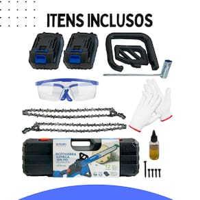 -1x Motosserra Elétrica -1x Maleta de ferramentas de plástico -2x Baterias de lítio 20000mAh -2x Correntes de 12 polegadas -1x Luva de segurança -1x Sabre -1x Alça -1x Freio de segurança/Guarda de proteção -1x Óculos de proteção -1x Garrafa de óleo lubrificante -1x Parafuso para fixação do sabre -4x Parafusos para fixação da alça -1x Carregador -1x Manual