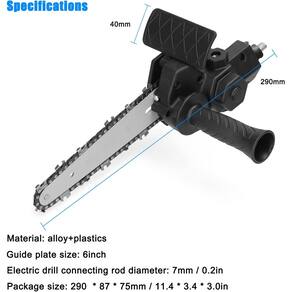 Você quer modificar sua furadeira elétrica em motosserras elétricas? Então você pode experimentar este acessório de modificação. Com este conjunto de ferramentas acessórias, você pode obter uma motosserra elétrica modificando sua furadeira elétrica em vez de comprar uma nova. Se você está procurando por este produto, venha e experimente, ele não o deixará na mão.Fácil de modificar: Com este conjunto de ferramentas de modificação, você não precisa para comprar uma nova motosserra, você só precisa gastar um pouco de tempo modificando-a, economizando seu dinheiro e tempo.Punho Auxiliar: O punho auxiliar também pode ser montado facilmente, você pode segurar com firmeza ao usar a máquina, proporciona uma experiência de uso confortável.Adaptabilidade: Este acessório de ferramenta modificado é adequado para brocas de pinça de três garras de 6-13 mm.Material preferido: A placa guia e as correntes são feitas de material de liga e a alça é feita de material plástico, o que pode proporcionar um longo tempo de serviço.Especificações: b>Material: liga plásticaCor: pretoTamanho da placa de guia: 6 polegadasAdequado para: broca de pinça de três mandíbulas de 6-13mmBroca elétrica Diâmetro da biela: 7mm/0.2inTamanho do pacote: 230*87*75mm/9.1* 3.4 * 3.0inPeso do pacote: 509g / 1.1lbLista de embalagem:1 * Conversor de furadeira elétrica1 * Punho1 * Placa guia1 * Correntes1 * Chave1 * Defletor1 * Chave de fenda/pfilips