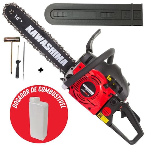 Motosserra Kawashima contém um design moderno, excelente acabamento, com componentes reforçados. Pode ser usado em cortes de madeiras, uso agrícola e em corte de galhos . O produto possui diversos sistemas de segurança como: trava de segurança do acelerador, protetor da mão esquerda e direita, pino pega corrente e freio automático de corrente
