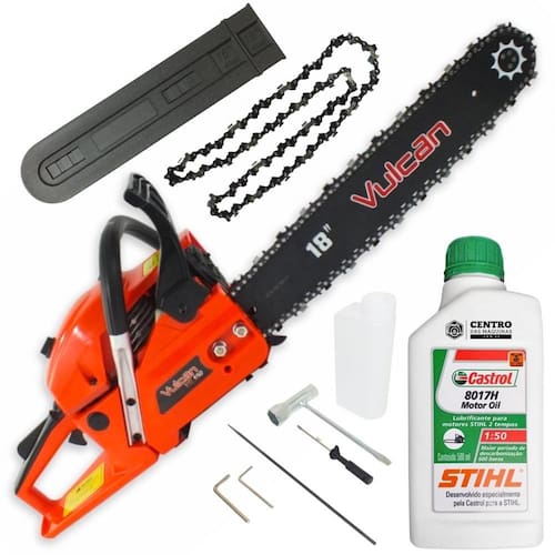OMOTOSSERRA É DA MARCA VULCAN, E ACOMPANHA UM ÓLEO 2T DA MARCACASTROL STIHL.