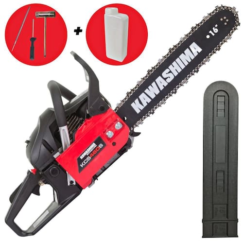 Motosserra Kawashima contém um design moderno, excelente acabamento, com componentes reforçados. Pode ser usado em cortes de madeiras, uso agrícola e em corte de galhos . O produto possui diversos sistemas de segurança como: trava de segurança do acelerador, protetor da mão esquerda e direita, pino pega corrente e freio automático de corrente