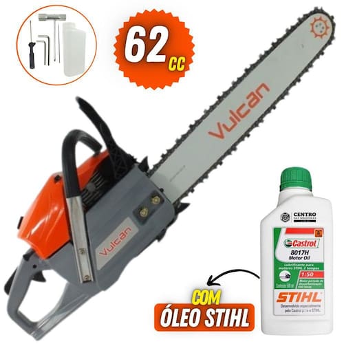 Motosserra Vulcan VS620 À Gasolina 2T 62cc 4HP 11500rpm Com Ponta Rolante 20 PolegadasASSISTÊNCIA TÉCNICA EM TODO TERRITÓRIO NACIONALPRODUTO COM 6 MESES DE GARANTIAFORTE E ECONOMICA ROBUSTA E COM ESTRUTURA RESISTENTEPEÇAS DE REPOSIÇÃO DE FÁCIL ACESSOEQUIPE DE PÓS VENDAS A DISPOSIÇÃOAs Motosserras à Gasolina Vulcan Trent, são máquinas modernas, com potência e durabilidade para garantir de maneira eficiente a aplicação em todos os trabalhos de corte. Como a motosserra VS620 é ideal para trabalhos de maior intensidade no corte de árvores e galhos. Também pode ser utilizada em outras atividades como corte de lenha, paisagismo, derrubada de árvores de grande porte, carpintaria e serviços de longo prazo em empreitada de pinos e eucalipto. A VS620 possui um sistema de partida fácil, com menos esforço, (easy start) que aumenta a vida útil do equipamento.Ficha Técnica:Modelo: VS620Motor: 2 temposPotência: 4HPCilindrada: 62ccRotação Máxima: 11.000 RPMRotação na lenta: 3.000 RPMSabre: VULCAN 20” (51cm) Ponta RolanteCorrente: Dentes: 34D; Passo: 3/8''; Bitola: 1,50mmIgnição: EletrônicaArranque: Manual com mola retrátil Amortecedores: SimCarburador: Membranas de alta eficiênciaCombustível: Gasolina com Óleo – Proporção 25:1Tanque do Combustível: 500mlTanque do Óleo: 350mlConsumo: aproximadamente 1,5L por horaAutonomia: Aproximadamente 20 minPeso do produto: 7,950kgDimensões do Produto: 31 x 28 x 88Itens e acessórios na(s) caixa(s): 1 Sabre 20”, 1 Corrente 34 Dentes, 1 Protetor do sabre, 1 Dosador de Combustível, 1 Lima, 1 Batente da Garra, 1 Jogo de chaves, 1 Óleo Stihl. Informações Adicionais:O MOTOSSERRA É DA MARCA VULCAN, E ACOMPANHA UM ÓLEO 2T DA MARCA CASTROL STIHL.A medida de utilização do óleo Castrol Stihl com o motosserra Vulcan é de 25:1ANTES DE USAR O ÓLEO É NECESSÁRIO A VERIFICAÇÃO DA DOSAGEM CERTA PARA SUA MÁQUINA, CADA MÁQUINA POSSUÍ UMA DOSAGEM DIFERENTE, CASO CONTRÁRIO PODE ACARRETAR AO MAL FUNCIONAMENTO DA MÁQUINA E ATÉ FUNDIR SEU MOTOR.VERIFIQUE NO MANUAL DE SUA MÁQUINA. Este lubrificante possui um elevado poder detergente, que evita o acúmulo de resíduos de carbono, além de:Limpeza mais efetiva do motor Reduz o acúmulo de resíduos de carbono, assim como a formação de vernizes e de lacas, na zona dos anéis do pistão, reduzindo o risco de travamento do motor.Aditivação anticorrosiva, protegendo as partes internas do motor.Ação antidesgaste Maior proteção contra o desgaste das partes móveis dos motores, mesmo em situações severas de uso.Formação de cinzas. Sua tecnologia exclusiva evita a formação de cinzas na cabeça do pistão, na janela de exaustão e nas velas, e prevenindo a pré-ignição.