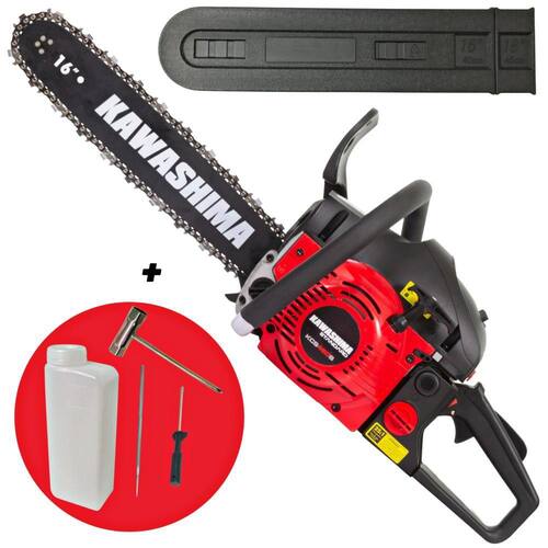 Motosserra Kawashima contém um design moderno, excelente acabamento, com componentes reforçados. Pode ser usado em cortes de madeiras, uso agrícola e em corte de galhos . O produto possui diversos sistemas de segurança como: trava de segurança do acelerador, protetor da mão esquerda e direita, pino pega corrente e freio automático de corrente