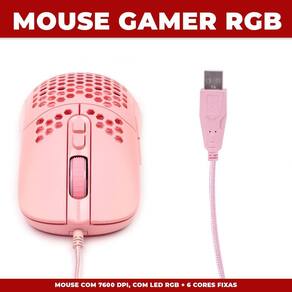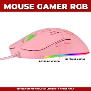 CARACTERÍSTICAS: Sensor: óptico Resolução Máxima:7600 DPI Configuração do DPI: 800 - 1600 - 2400 - 3200 - 4800 - 6400 - 7600 Formato: Parcialmente Ambidestro Dimensões: 12,5x6,5x3,5cm Peso aproximado: 100g Quantidade de botões: 7 Conexão: USB Cabo: 1,8 metros LED: RGB 6+1 Material: Plástico ABS Alimentação: Via USB Homologação Anatel: 037781505304 Ean: 7908445400894
