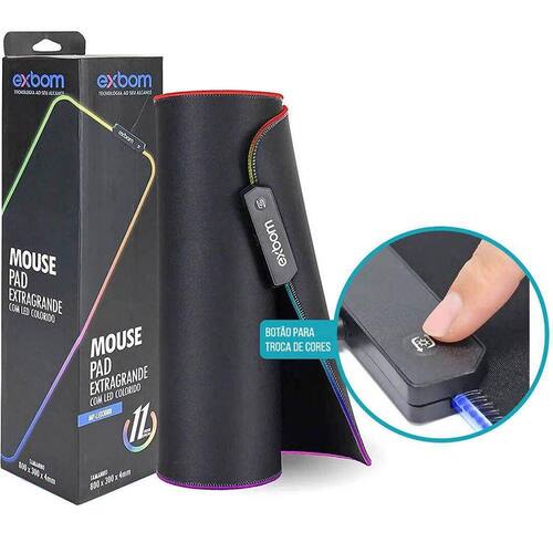 Especificações: - 7 cores de iluminação led; - comporta teclado e mouse juntos; - superfície em tecido sintético para melhorar uso do mouse; - base em borracha texturizada antiderrapante; - bordas arredondadas e iluminadas; - área útil: 800 x 300 x 4 mm; - alimentação: cabo usb de 5 v; - comprimento do cabo usb: aprox. 100 centímetros; - estampa preta padrão.