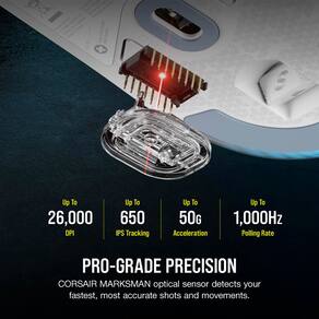 - Sensor óptico ultrapreciso de 26k DPI: com 26.000 DPI nativos, rastreamento de 650 IPS e aceleração de até 50G, o sensor óptico CORSAIR MARKSMAN captura com precisão movimentos rápidos do mouse, varreduras rápidas e recentralizações rápidas.